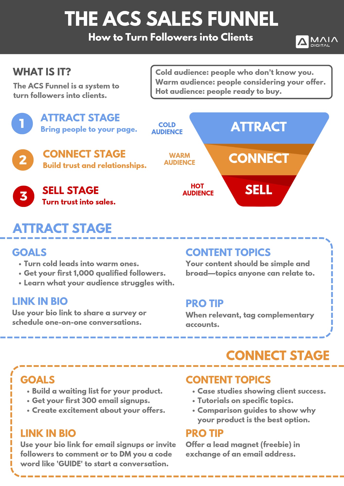 The ACS Funnel is our proven 3-step system to turn strangers into paying clients. It works in three stages: Attract, Connect and Sell. Each stage moves your audience from cold, to warm, to hot. It's not a one-time tactic, it's a repeatable cycle that works for any business, in any niche.